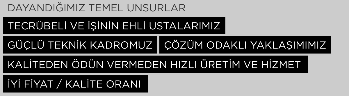 BİZİ BİZ YAPAN BİR OLMAMIZ // Her biri dalında uzman atölyelerimizden doğrudan hizmet vermekteyiz. Tecrübeli ustalarımızın ellerinden çıkan ürünler tasarımcı, mimar, mühendis ve teknik yeterliliği günden güne artan kadromuzun katkıları ile sahada birer sanat eserine dönüşmekteler. İyi işletilen atölyelerimiz birbirleri ile tam bir uyum içerisinde çalışabildiklerinden çeşitli malzemelerin bir araya geldiği imalatlarda hızlı, hatasız, estetik değeri yüksek ve ekonomik işler çıkarabilmekteyiz. |